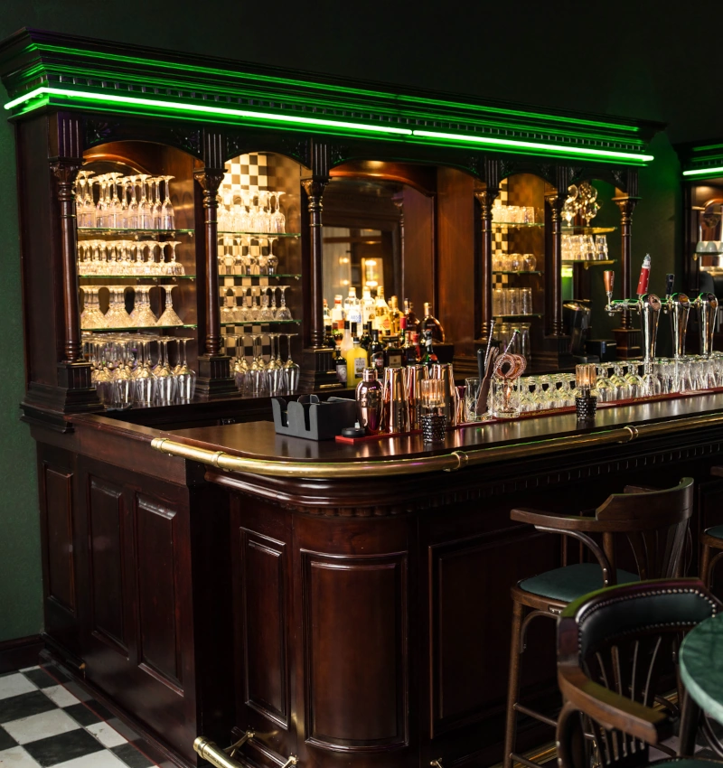 Bij binnenkomst wordt u ontvangen aan onze klassieke balie, geïnspireerd op de Amerikaanse stijl. Rechts bevindt zich een indrukwekkend Engels bureau en een stijlvolle bar. Deze ruimte is geen traditionele lounge, maar een elegante wacht- en ontmoetingsplek.